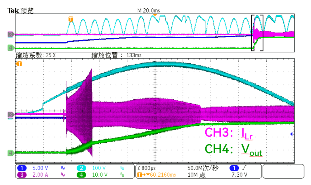 在啟動過程中,除了通過逐步降低開關(guān)頻率實現(xiàn)軟啟動,芯片還直接控制諧振電容電壓的振幅逐步增加,從而限制了諧振腔的輸出能量,因此啟動電流過沖小。