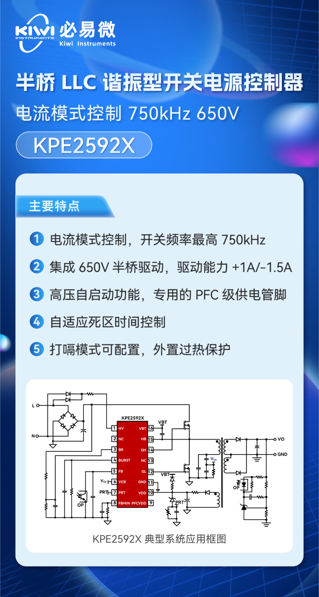 KPE2592X 具有諸多優(yōu)點,以實現(xiàn)高性能,高可靠性的 LLC 功能。