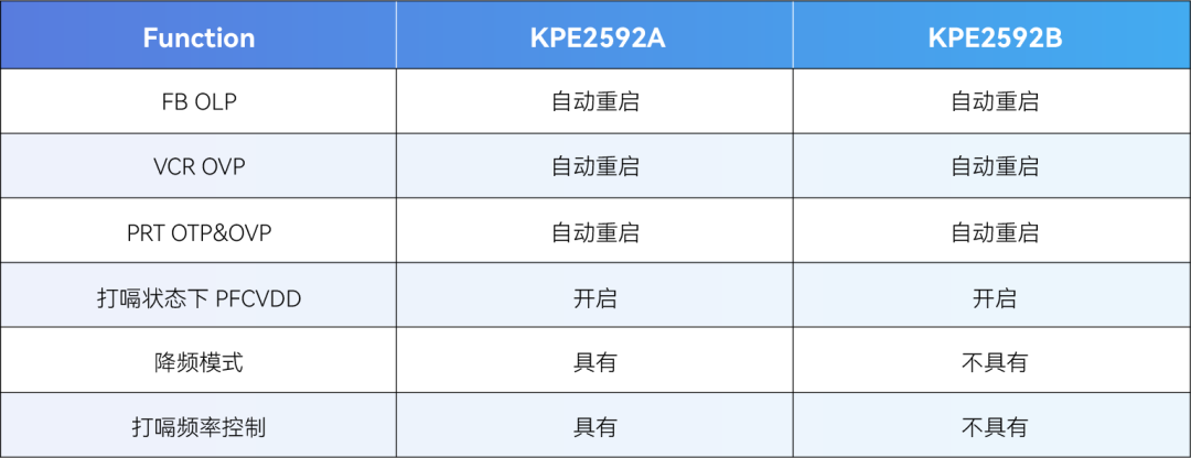 KPE2592X 具有較多的可配置參數(shù),目前可供貨的版本有 KPE2592A 和 KPE2592B,對于輕載效率及紋波無嚴苛要求的應用場合,推薦使用 KPE2592B 版本。若有其它參數(shù)變更的需求,請聯(lián)系我司銷售。